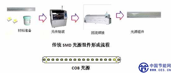 從上圖可以看出COB光源在應(yīng)用端省去了貼片和回流焊的流程,大幅度降低了應(yīng)用端生產(chǎn)和制造流程,同時(shí)可省去相應(yīng)的設(shè)備,生產(chǎn)制造設(shè)備投入成本更低,生產(chǎn)效率更高。