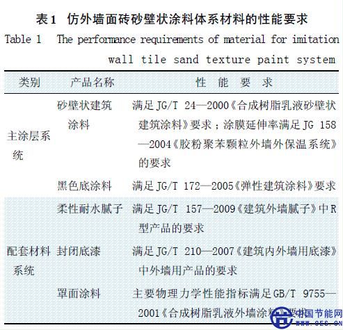 仿外墻面磚砂壁狀涂料體系材料的性能要求如表1所示。