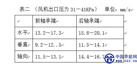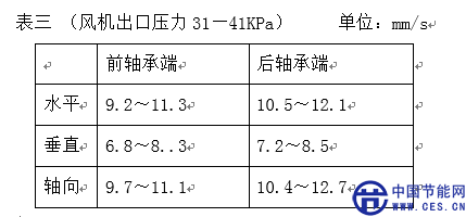 為查清原因,5月3日用振通908簡(jiǎn)易測(cè)振儀對(duì)風(fēng)機(jī)水平、垂直、軸向振動(dòng)進(jìn)行測(cè)量,風(fēng)機(jī)出口壓力在31—41KPa運(yùn)行時(shí)結(jié)果如表2,由測(cè)量結(jié)果可看出,后軸承端比前軸承端振動(dòng)值大3mm/s左右,說(shuō)明振動(dòng)是從后軸承端引起。為檢查是否存在轉(zhuǎn)子動(dòng)不平衡,對(duì)風(fēng)機(jī)出口壓力下降到21--34KPa和升到35—45KPa分別進(jìn)行了測(cè)量,振動(dòng)值無(wú)明顯變化。因此可以肯定,風(fēng)機(jī)轉(zhuǎn)子不存在動(dòng)不平衡,振動(dòng)源出在風(fēng)機(jī)后端,可能是軸承及軸系零件松動(dòng)造成。
