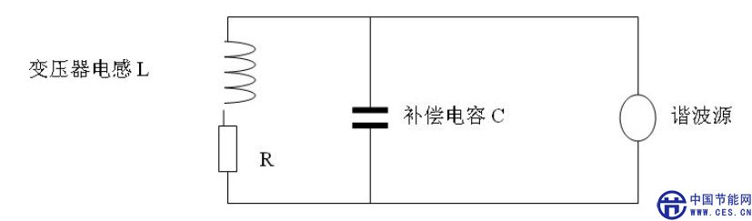 在電力系統(tǒng)中,變壓器與無(wú)功補(bǔ)償電容構(gòu)成了一個(gè)LC并聯(lián)電路,如圖1所示。這個(gè)電路有一個(gè)固有的振蕩角頻率f0,當(dāng)諧波電流的頻率與f0相同時(shí),LC并聯(lián)電路就發(fā)生了諧振現(xiàn)象,電流在LC回路中逐漸增大,一直達(dá)到某一個(gè)很大的數(shù)值。這個(gè)很大的數(shù)值就是發(fā)生諧振的諧波電流Q倍。Q稱為L(zhǎng)C并聯(lián)電路的Q值,一般為10~15。這樣大的諧波電流就會(huì)導(dǎo)致無(wú)功補(bǔ)償裝置燒毀。