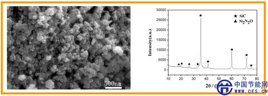 下圖是空氣中燃燒合成技術(shù)制備的納米SiC粉體掃描電鏡(SEM)照片及X射線衍射(XRD)圖譜。合成產(chǎn)品的含微量的Si2N2O相,主相是納米級的β-SiC粉體。