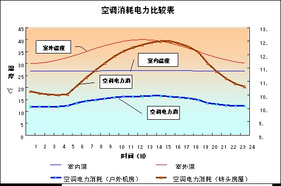圖四為我們?cè)谀郴镜膶?shí)測(cè)數(shù)據(jù)對(duì)比,可以看出戶(hù)外機(jī)房的明顯的節(jié)能作用,平均具有20%以上的節(jié)能效果。
