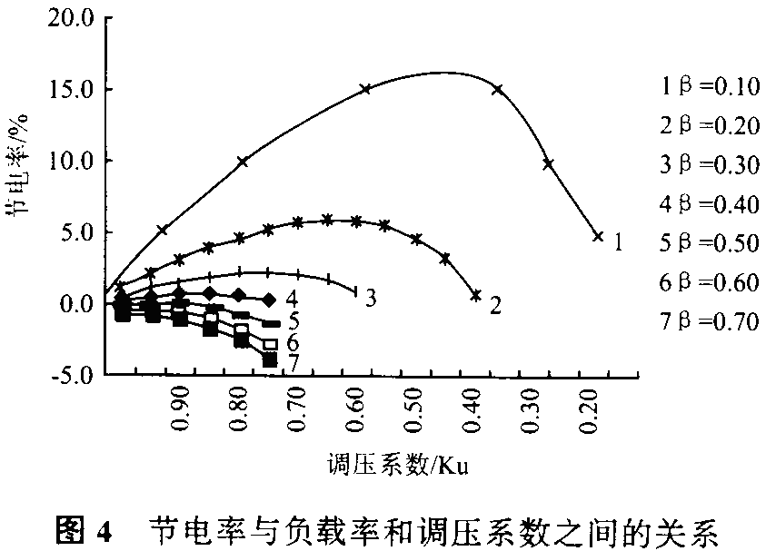 由圖4可以看出,對應不同的負載率,都有一個最好的調(diào)壓系數(shù),而且如果降壓太多,非但不能節(jié)能,而且還會使能耗增加,圖4中節(jié)電率為負就是很好的說明。