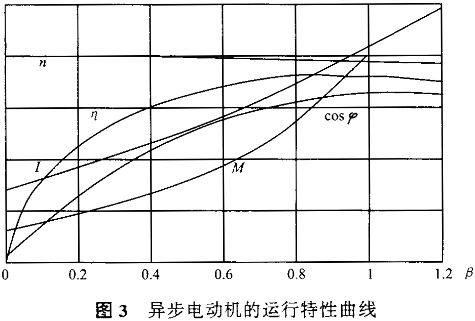 電動機運行特性定義β=P2/PN,即電動機負載與額定負載的比值,橫坐標為β。