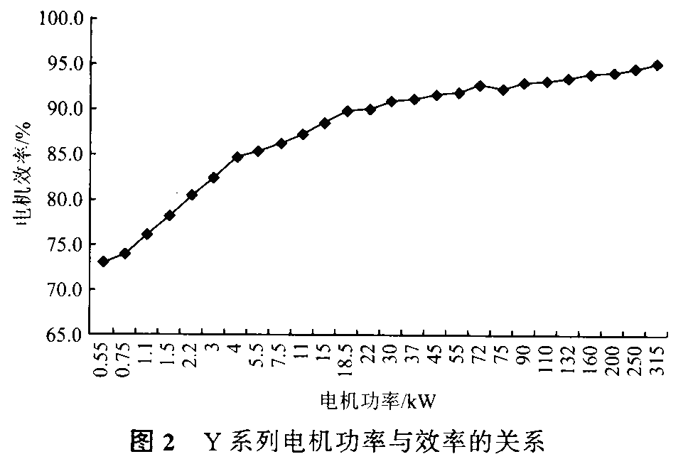 以Y系列電機為例,電機越小、效率越低;電機越大、效率越高。同樣功率的電機轉速越低、效率越低,轉速越高、效率越高。圖2為Y系列電機功率與效率的關系曲線(電機效率是將同功率不同極數(shù)的效率平均得到)。