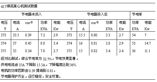 陽煤集團二礦選煤廠有兩臺煤泥離心機(設(shè)備編號:417,418),設(shè)備功率相同,負載相同,同時開停,在其中一臺安裝電機節(jié)電器,另一臺不用電機節(jié)電器,這樣就可以作出科學的對比結(jié)果,選擇在417上安裝了電機節(jié)電器,418按原來控制方法運行,兩臺設(shè)備同時都加裝了電度表進行測試。同時在電機節(jié)電器投入運行前后,對417煤泥離心機的運行數(shù)據(jù)進行測量對比,了解節(jié)電器的運行效果。