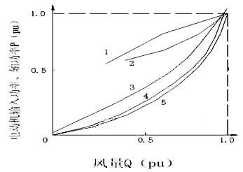 1—輸出端風(fēng)門控制時的電動機輸入功率2—輸入端風(fēng)門控制的電動機輸入功率3—轉(zhuǎn)差功率調(diào)速(滑差電動機、液力耦合器)時電動機的輸入功率4—變頻器調(diào)速控制時的電動機輸入功率5—理想輸入功率