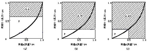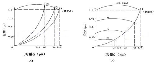 圖2.2(a)為采用第一種方法時的特性 ,管路的節(jié)流阻力改變時,可以得到所需的送風(fēng)特性。圖2.2(b)為調(diào)速情況下風(fēng)機的運行特性圖中(pu)均采用標(biāo)么值。