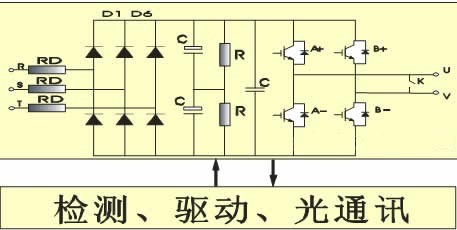 DFCVERT—MV變頻器的功率單元是以交—直—交的形式組成的,它是先把工頻交流電通過整流器變成直流電,然后再把直流電變換成頻率、電壓均可控制的PWM波交流電。它由三部分組成既整流器、逆變器和中間環(huán)節(jié)如圖3.1所示: