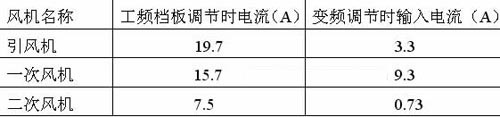由于在相同條件下風(fēng)壓和流量的大小與電機電流的大小成正比所以這里只用工頻運行檔板調(diào)節(jié)時的電機電流和變頻調(diào)節(jié)時變頻器的輸入電流作一比較從而說明節(jié)電效果。