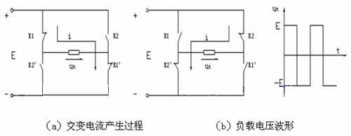 當(dāng)兩組開關(guān)K1、K1’和K2、K2’輪流切換時,負(fù)載R上便得到了交變電壓uR。如果這兩組開關(guān)利用四只電子開關(guān)器件來代替并輪流導(dǎo)通與關(guān)斷就實現(xiàn)了由四只電子開關(guān)器件控制的直流——交流逆變。
