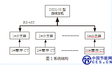 本系統(tǒng)采用上下位機(jī)構(gòu)成的分布式結(jié)構(gòu),整個(gè)系統(tǒng)包括主機(jī)、數(shù)據(jù)采集分支器、高精度零序電流互感器三部分。通常,一個(gè)變電站只需一臺(tái)選線主機(jī)和若干臺(tái)信號(hào)采集分支器以及若干臺(tái)零序電流互感器組成一個(gè)完整的分布式接地選線系統(tǒng)。系統(tǒng)結(jié)構(gòu)如圖1所示。