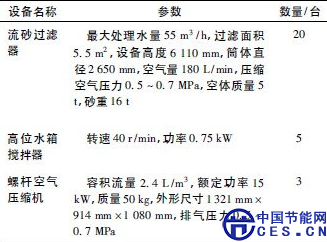 齊魯乙烯污水處理場現(xiàn)有流砂過濾器20 臺,為同行業(yè)處理規(guī)模最大。螺桿空氣壓縮機3 臺,5個高位水箱(含攪拌器) 。主要設(shè)備參數(shù)見表1。