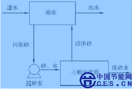 原水經(jīng)錐形引水道進入濾床,濾床中的石英砂截留原水中的懸浮物。過濾后的凈水經(jīng)溢流堰,由出水管流出過濾器。濾床中被懸浮物污染的石英砂,由提砂泵輸送到流砂過濾器頂部的三相分離器。在三相分離器中空氣、水、石英砂分離,被洗凈的石英砂重新均勻分布到濾床中央,洗砂水經(jīng)排水裝置排出。工藝流程示意見圖2。