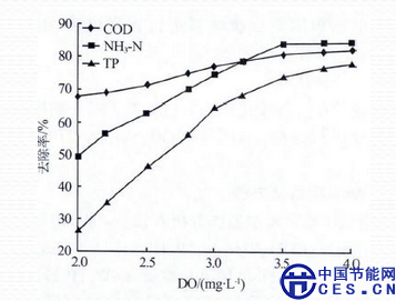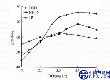 固定HRT=36 h,MLSS 為3 300 mg/L,初級好氧池DO 在3.5 mg/L,改變次級好氧池DO,考察次級好氧池DO 對COD、NH3-N、TP 去除率的影響,結(jié)果見圖 4。