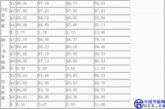 從表 1 可以看出,以COD 去除率為檢測指標最佳組合工藝為A4B4C3D3,以NH3-N 去除率為檢測指標最佳組合工藝為A4B3C3D3,以TP 去除率為檢測指標最佳組合工藝為A3B4C3D3。因COD、NH3-N 的A3、A4相差較小,而A4會增加不少投資,所以與TP 去除率結(jié)合選擇A3;COD、TP 選B4,而NH3-N 的B3、B4相差很小,因此取B4。根據(jù)正交試驗分析可知,最佳工藝參數(shù)選擇為A3B4C3D3,即:HRT=36 h、初級好氧池DO 為4.0 mg/L、次級好氧池DO 為3.5 mg/L、MLSS 為3 560 mg/L。
