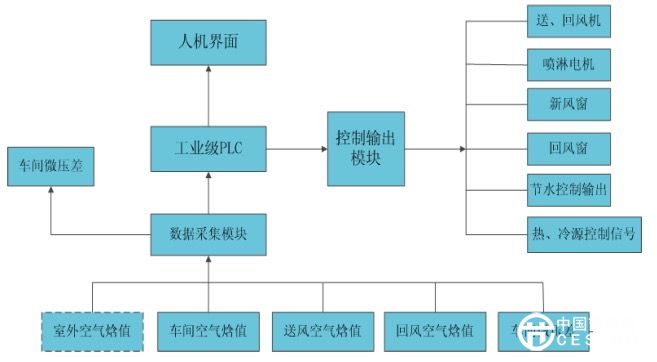 根據(jù)回風(fēng)溫濕度與設(shè)定值的參數(shù)偏差,通過CPU的控制算式,自動(dòng)分析確定控制送風(fēng)溫度、回風(fēng)溫度在要求的控制范圍內(nèi),以滿足生產(chǎn)工藝及舒適度要求。