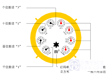 目前,全國居民用水戶通常使用的是DN15~25機械水表。水表表盤上共有8個數(shù)碼指針,其中4個紅色,4個黑色,讀數(shù)的單位為立方米。紅色指針表示不到1立方米,代表小數(shù)點后的讀數(shù),一般情況下不用讀出。黑色指針中,“×1”代表個位數(shù),“×10”代表十位數(shù),“×100”代表百位數(shù),“×1000”代表千位數(shù)。每一擋的指針,若處在二個數(shù)之間,則讀上一個數(shù),如圖所示:千位針處在1和2之間,讀1;百位針處在5和6之間,讀5;十位針處在1和2之間,讀1;個位針處在3與4之間,讀3:所以圖中水表行碼的正確讀數(shù)為1513立方米。