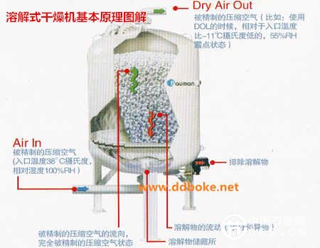 其實溶解式干燥機里面有一種:溶解劑,它主要是靠這種溶解劑來吸收壓縮空氣中的水分。一般含有水分的空氣與溶解劑產(chǎn)生化學(xué)反應(yīng),以凝縮水的形態(tài)落在干燥機的底部,空氣氣流經(jīng)過干燥機內(nèi)部的溶解劑層向上流,那么溶解劑吸收多余的水分使它慢慢融化。