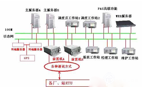 使用集線器構成網(wǎng)絡結構,網(wǎng)絡速率100Mb/s,配置雙前置機/數(shù)據(jù)服務器、雙調(diào)度員工作站、管理信息工作站、智能多串口、雙切開關、調(diào)制解調(diào)器柜、衛(wèi)星鐘,以后可根據(jù)具體情況任意增加工作站。