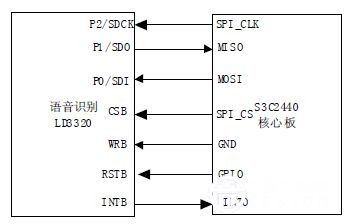 為了使系統(tǒng)能夠識別操作人員發(fā)出的語音指令,設(shè)計中采用了由ICRoute公司設(shè)計生產(chǎn)的非特定人語音識別芯片LD3320,它集成了語音識別處理電路和一些外部電路,包括AD、DA轉(zhuǎn)換器、麥克風接口、聲音輸出接口等,不需要外接任何的輔助芯片如Flash、RAM。在主控制器的控制下,可以識別出預先添加到識別列表中的內(nèi)容。設(shè)計中參考了ICRoute發(fā)布的LD3320數(shù)據(jù)手冊,圖中LD3320的P0、P1、P2引腳通過SPI接口與嵌入式處理器相接,控制信號WRB、CSB、RSTB以及中斷返回信號引腳INTB與處理器S3C2440直接相連,如圖3所示。