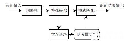 語音識別主要包括兩個階段:訓練階段和識別階段。在訓練或識別過程中,都必須對輸入語音進行預處理和特征提取。訓練階段通過用戶輸入的若干次訓練語音,經(jīng)過預處理和特征提取后得到特征參數(shù),最后通過特征參數(shù)建模,進而建立訓練語音的參考模型庫。而識別階段是將輸入語音的特征矢量參數(shù)和參考模型庫中的參考模型進行相似性度量,然后把相似度最高的輸入特征矢量作為識別結(jié)果輸出,從而達到語音識別目的,如圖1所示。