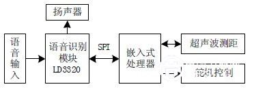 在實際應(yīng)用中,現(xiàn)代技術(shù)開發(fā)嵌入式語音識別有兩種實現(xiàn)方式:調(diào)入嵌入式語音開發(fā)包和外擴語音識別芯片。本文的語音識別系統(tǒng)方案是以嵌入式處理器S3C2440為核心,外擴非特定人語音識別芯片LD3320,并將超聲波測距模塊和云臺相結(jié)合作為系統(tǒng)的機械執(zhí)行機構(gòu)。系統(tǒng)測量過程如下:首先根據(jù)語音指令控制兩自由度云臺的位姿,使超聲波探測器指向特定方向,然后開啟超聲波探測器,測量出前方障礙物距離,最后將測量結(jié)果轉(zhuǎn)化為可以播放的二進制數(shù)據(jù)流,通過LD3320的播放功能完成數(shù)據(jù)的播放。