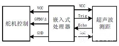 超聲波測距原理相對比較成熟,系統(tǒng)中采用超聲波測距模塊HC-SR04。該模塊有兩個TTL電平通信引腳,兼容3.3V電平。其中,控制端口Trig發(fā)一個10us以上的高電平,接收端口Echo將輸出與距離成正比的高電平信號。當Echo有高電平輸出時就開啟處理器定時器,當端口電平跳變?yōu)榈碗娖綍r關(guān)閉定時器,根據(jù)定時器的值可計算得到障礙物的距離。其中,控制端口Trig和接收端口Echo分別接至處理器的GPG9、GPG6引腳。