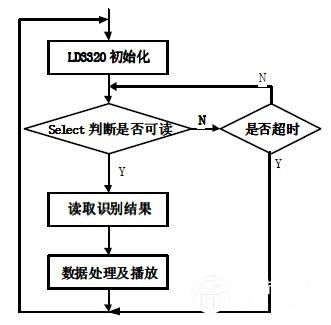 語音識別功能的驅(qū)動程序工作流程為通用初始化à語音識別用初始化→寫入識別列表→開始識別→響應(yīng)識別中斷。為了提高識別成功率,在識別列表中增加了“垃圾關(guān)鍵詞”以吸收錯誤的識別。上層應(yīng)用程序為語音識別功能分配了單獨的進程,通過ioctl()函數(shù)控制LD3320的工作狀態(tài),read()函數(shù)可以讀取識別結(jié)果。程序中使用select機制實現(xiàn)read()函數(shù)的非阻塞訪問。同時,設(shè)定select監(jiān)控超時時間,在超時后,重新初始化語音識別芯片LD3320,為下一次語音識別做準備,如圖6所示。