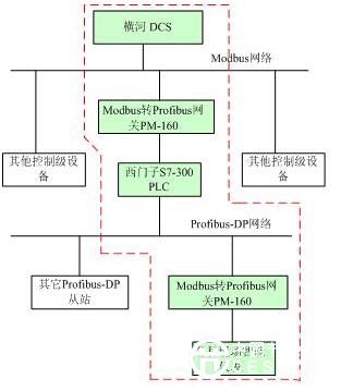 如圖1所示,在該系統(tǒng)設(shè)計(jì)中有兩個(gè)網(wǎng)絡(luò)使用了上海泗博自動(dòng)化的Modbus轉(zhuǎn)Profibus-DP網(wǎng)關(guān)PM-160。網(wǎng)關(guān)在這兩個(gè)網(wǎng)絡(luò)中的作用不一樣,其中:在上層網(wǎng)絡(luò)中(建立西門子S7-300PLC和橫河DCS連接通信),Modbus轉(zhuǎn)Profibus-DP網(wǎng)關(guān)PM-160在Modbus側(cè)做Modbus從站,在Profibus-DP側(cè)做從站,建立Profibus-DP主站(西門子S7-300 PLC)和Modbus主站(橫河CS3000)的通信。DCS通信部分采用橫河型號(hào)為ALR121的通信模塊,并配套橫河提供的Modbus通信軟件包,該通信模塊最大通信數(shù)據(jù)容量為4000字。通過(guò)上海泗博自動(dòng)化的網(wǎng)關(guān)配置軟件對(duì)PM-160進(jìn)行相關(guān)配置,將DCS的讀、寫(xiě)指令及數(shù)據(jù)做相應(yīng)轉(zhuǎn)換、存儲(chǔ),并映射到西門子PLC的輸入、輸出映像區(qū),以實(shí)現(xiàn)對(duì)上下位機(jī)控制信息的實(shí)時(shí)傳輸。