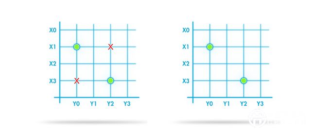 (2)互電容感應(yīng):檢測(cè)網(wǎng)格每個(gè)交互點(diǎn)的電荷變化(X*Y)。因此,它可以精確感應(yīng)多點(diǎn)觸控。見圖1