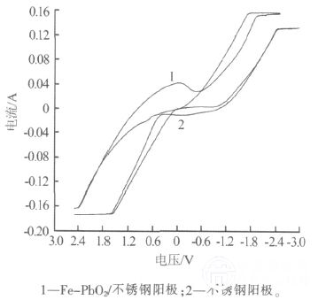 電極表面上產(chǎn)生的強(qiáng)氧化性中間體如羥基自由基主要在陽極表面產(chǎn)生,它所面臨的主要競爭副反應(yīng)就是陽極氧氣的析出。因此作為電催化來氧化降解有機(jī)物的陽極必須具有較高的析氧超電位。分別用厚度、面積相同的不銹鋼板和Fe-PbO2/不銹鋼電極做陽極,同樣面積的不銹鋼板作陰極,飽和甘汞電極為參比電極,使用CHI660C 型電化學(xué)工作站,在硫酸鋁-印染廢水溶液中,用循環(huán)伏安法進(jìn)行對比實(shí)驗(yàn)。分析比較兩種電極對印染廢水的催化活性。