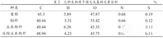 生物質(zhì)的元素組成通常僅僅指其有機(jī)質(zhì)的元素組成,例如,秸稈主要由C、H、O、N、S5種元素組成,它們的含量約為C40%~46%、H5%~7%、O47%~55%、N0.6%~1.0%、S0.1%~0.2%,還有一些少量的元素如Cl、P、K、Si等。幾種生物質(zhì)干燥無灰基的元素分析見表2。