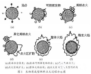 生物質(zhì)成型燃料的點(diǎn)火過程是指生物質(zhì)成型燃料與氧分子接觸、混合后,從開始反應(yīng),到溫度升高至激烈的燃燒反應(yīng)前的一段過程。實(shí)現(xiàn)生物質(zhì)成型燃料的點(diǎn)火必須滿足:生物質(zhì)成型燃料表面析出一定濃度的揮發(fā)物,揮發(fā)物周圍要有適量的空氣,并且具有足夠高的溫度。生物質(zhì)成型燃料的點(diǎn)火過程是: