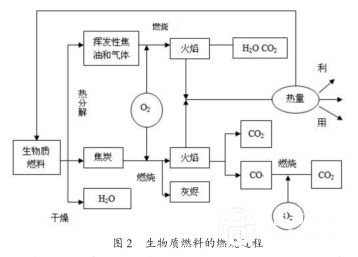 燃料送入燃燒室后,在高溫?zé)崃?由前期燃燒形成)作用下,燃料被加熱和析出水分。隨后,燃料由于溫度的繼續(xù)增高,約250℃左右,熱分解開始,析出揮發(fā)分,并形成焦炭。氣態(tài)的揮發(fā)分和周圍高溫空氣摻混首先被引燃而燃燒。一般情況下,焦炭被揮發(fā)分包圍著,燃燒室中O2不易滲透到焦炭圖2生物質(zhì)燃料的燃燒過程表面,只有當(dāng)揮發(fā)分的燃燒快要終了時(shí),焦炭及其周圍溫度已很高,空氣中的O2也有可能接觸到焦炭表面,焦炭開始燃燒,并不斷產(chǎn)生灰燼。