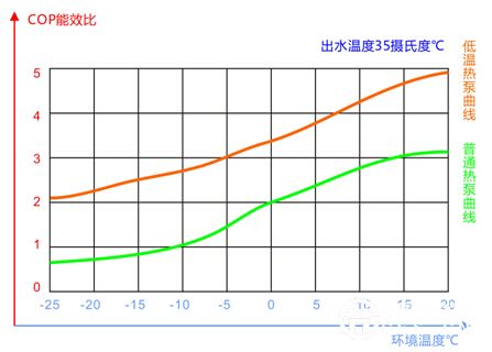 上面講了很多技術(shù)特點,那么到底低溫熱泵可以節(jié)能多少呢?通過下面的性能曲線進行一次對比:從圖中可以看出當出水溫度設(shè)定為35℃時,普通熱泵當環(huán)境溫度低于-5℃時,能效比大大降低,低于-10℃時,能效比僅有1.1左右,幾乎不節(jié)能。而低溫熱泵機組在-25℃能效比依然可以高達2.0左右,環(huán)境溫度7℃能效比甚至可以達到4.0,大幅提升了機組的節(jié)能效果。
