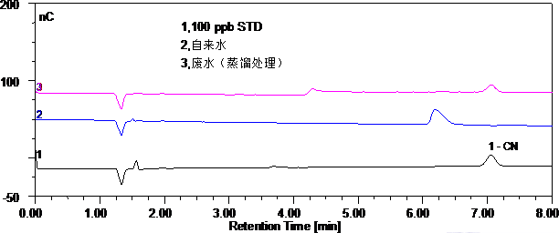 對(duì)于食品、紡織品等樣品,前處理方法與檢測(cè)條件與水質(zhì)原理一致。而對(duì)于空氣樣品,則需以采樣泵將空氣持續(xù)泵入堿性吸收液即可完成采集,簡(jiǎn)單過(guò)濾后即可進(jìn)樣分析。25µL進(jìn)樣體積為例,氰化物的測(cè)定限可達(dá)到0.001mg/L。此外通過(guò)增大定量環(huán)進(jìn)樣體積還可以獲得靈敏度的成倍增加。方法將具有獨(dú)特選擇性的離子交換柱將不同價(jià)態(tài)、形態(tài)的離子化合物予以分離,再結(jié)合選擇性較強(qiáng)的安培檢測(cè)器,使得方法的選擇性和專(zhuān)屬性較強(qiáng)。