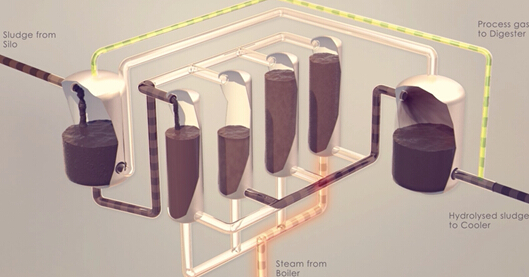 這是典型的熱水解工藝圖。熱水解預(yù)處理系統(tǒng)由一個漿化罐、四個到六個反應(yīng)罐、和一個卸壓閃蒸罐組成。污泥經(jīng)螺桿泵從儲泥罐連續(xù)不斷地送入漿化罐、再經(jīng)過螺桿泵以批次方式送入各個反應(yīng)罐、在批次加入蒸汽進行高壓蒸煮后、在反應(yīng)罐自身壓力推動下污泥進入閃蒸罐卸壓閃蒸。閃蒸后釋放的蒸汽回到漿化罐,對污泥進行預(yù)熱漿化。閃蒸后的熱水解污泥在閃蒸罐停留一定時間,并通過螺桿泵連續(xù)不斷地送出到下一步冷卻工藝中。熱水解預(yù)處理系統(tǒng)按照預(yù)定程序周而復(fù)始運行。