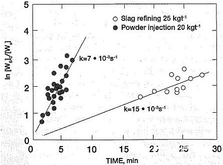 在LF站噴粉或喂線是常見的鋼水脫硫操作。圖4給出這兩種脫硫技術的脫硫效率,由于目標是實現(xiàn)在無渣參與的情況下通過反應劑和金屬反應獲得所需脫硫效果,關鍵問題是反應產(chǎn)物CaS的上浮。而且,CaSi或CaC2的使用總是導致鋼中增硅或增碳,這對某些鋼種而言可能是嚴重問題。