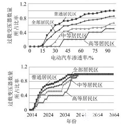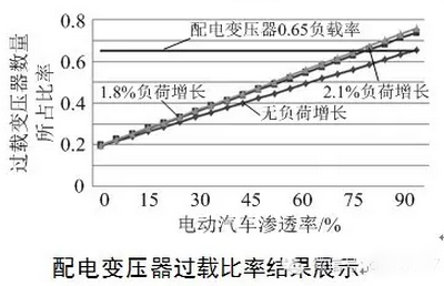 研究結(jié)果顯示,居民區(qū)住戶經(jīng)濟條件、住戶生活習(xí)慣、居民區(qū)現(xiàn)有基本用電負(fù)荷及基本負(fù)荷增長率等因素對評估配電網(wǎng)接納電動汽車充電能力的結(jié)果影響較大。因此,在評估時綜合考慮這些因素可使評估結(jié)果更加準(zhǔn)確、有效。在電動汽車滲透率增加到一定程度時,電動汽車充電負(fù)荷的影響不容忽視,部分居民區(qū)配電變壓器存在過載風(fēng)險,須采取控制充電負(fù)荷或升級配電網(wǎng)等措施來保證配電網(wǎng)的安全運行。