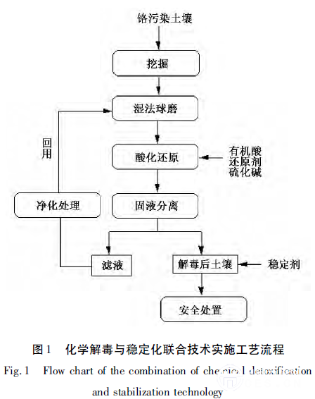 在需修復(fù)的鉻污染場(chǎng)地上挖掘污染土50 t,送入球磨機(jī)濕磨,將鉻污染土粉碎至100 目以上。進(jìn)入反應(yīng)罐前加入一定量的工藝循環(huán)水或清水調(diào)整固液比,用渣漿泵輸送至酸化還原反應(yīng)罐。邊攪拌邊加入硫酸進(jìn)行酸化至pH 穩(wěn)定在5 左右,再陸續(xù)加入2 t 的硫化鈉,4t 硫酸亞鐵,2t 焦亞硫酸鈉,反應(yīng)2 h,使溶出的六價(jià)鉻還原為三價(jià)鉻。待反應(yīng)好后土壤漿料送至熟化罐中熟化12 h,檢測(cè)土壤漿料中的鉻含量,當(dāng)還原好的土壤漿料經(jīng)檢驗(yàn)合格后進(jìn)入壓濾機(jī)進(jìn)行壓濾脫水。脫水后的解毒鉻污染土混合先后拌入2 t 石灰、1 t 高嶺土和1 t 膨潤(rùn)土,充分?jǐn)嚢柽M(jìn)行穩(wěn)定化處置( 圖1) 。
