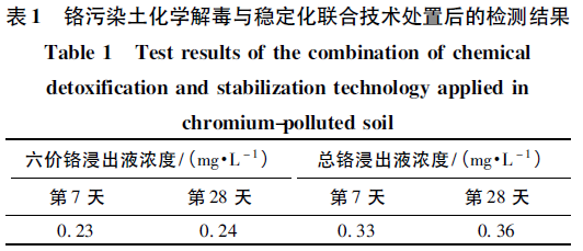 檢測(cè)處理后第7 天和第28 天土壤六價(jià)鉻、總鉻浸出濃度,結(jié)果如表1 所示。浸出液的制備參照HJ /T 299—2007《固體廢物浸出毒性浸出方法硫酸硝酸法》執(zhí)行,六價(jià)鉻浸出濃度按標(biāo)準(zhǔn)GB /T 15555. 4—1995《固體廢物六價(jià)鉻的測(cè)定二苯碳酰二肼分光光度法》測(cè)定,總鉻浸出濃度按標(biāo)準(zhǔn)GB /T 15555. 5—1995《固體廢物總鉻測(cè)定二苯碳酰二肼分光光度法》測(cè)定。