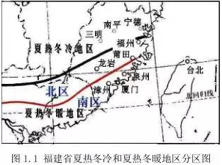 1.4寧德、南平和三明屬夏熱冬冷地區(qū);福州、莆田和龍巖屬夏熱冬暖地區(qū)北區(qū);泉州、廈門和漳州屬夏熱冬暖地區(qū)南區(qū)。(見圖1.1)