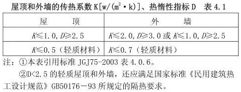居住建筑屋頂和外墻的傳熱系數(shù)和熱惰性指標(biāo)應(yīng)符合表4.1的規(guī)定。