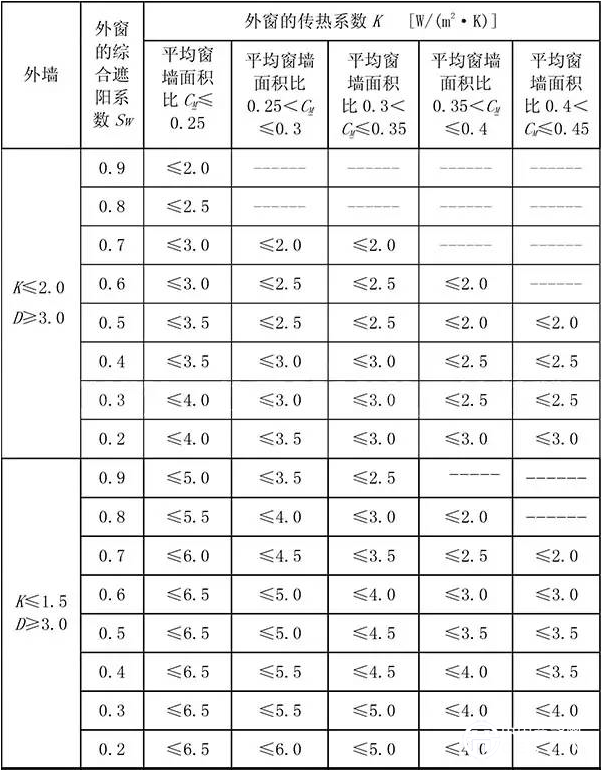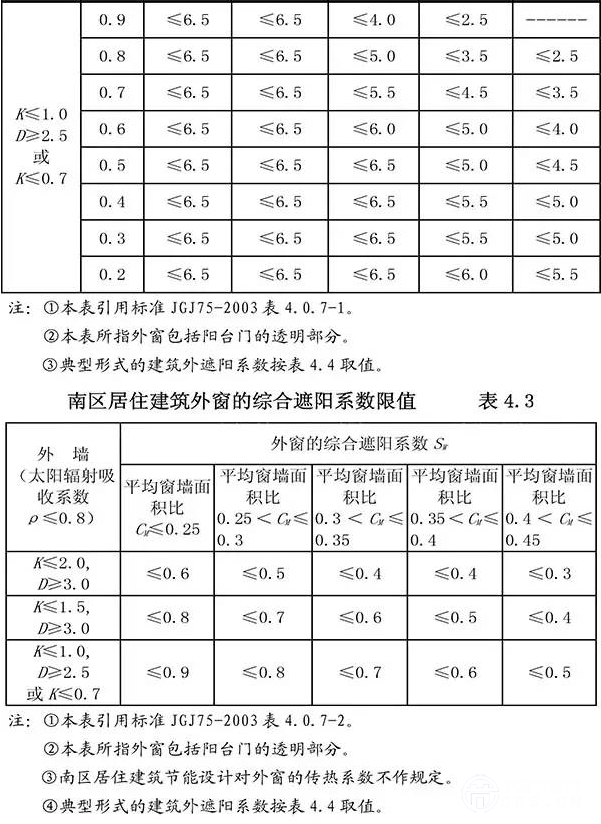 4.1.3.3居住建筑采用不同平均窗墻面積比時,其外窗的傳熱系數(shù)K和綜合遮陽系數(shù)SW應(yīng)符合表4.2和表4.3的規(guī)定。