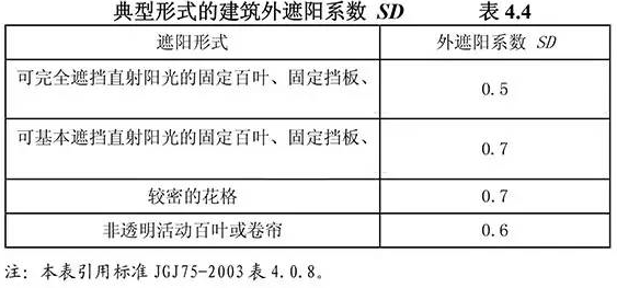 Sw=SC·SD,SD為建筑外遮陽系數(shù),典型建筑外遮陽系數(shù)SD可按表4.4取值,或按標(biāo)準JGJ75-2003附錄進行詳細計算;無建筑遮陽時SD=1,即SC=SW。常用外窗本身遮陽系數(shù)SC參照附錄表D.1,或核查企業(yè)的產(chǎn)品資料。