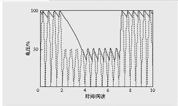 圖2為電壓暫降發(fā)生前、暫降期間與暫降結(jié)束后整流器直流側(cè)電壓的變化情況示意圖,暫降幅值為50%,無(wú)相移。圖中虛線為交流電壓絕對(duì)值。發(fā)生電壓暫降時(shí),由于交流側(cè)電壓的突然降低,其最大值小于直流側(cè)電壓,因此二極管處于關(guān)斷狀態(tài),電容器開(kāi)始放電,直至電容器電壓小于暫降期間交流電壓的最大值為止。此后將建立一個(gè)新的平衡點(diǎn)。電容器放電只取決于直流側(cè)負(fù)荷,而與交流電壓無(wú)關(guān),因此對(duì)于給定負(fù)荷,任何幅值的電壓暫降都將引起相同的直流側(cè)電壓的初始衰減,但衰減的持續(xù)時(shí)間取決于暫降的幅值。
