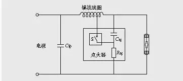 電子式鎮(zhèn)流器動(dòng)作原理可以分成三級(jí):第一級(jí)將輸入的交流電源通過(guò)整流電路轉(zhuǎn)成直流,并經(jīng)過(guò)直流對(duì)直流升壓轉(zhuǎn)換電路進(jìn)行功率因數(shù)修正;第二級(jí)為直流對(duì)直流降壓轉(zhuǎn)換電路,用于提供一個(gè)可變的直流,因?yàn)镠ID在點(diǎn)燈的過(guò)程中由瞬時(shí)到穩(wěn)態(tài)燈管等效電阻變化很大,所以需要一個(gè)可變的直流進(jìn)行控制;第三級(jí)利用一個(gè)點(diǎn)火器產(chǎn)生一個(gè)高壓將燈點(diǎn)亮,燈泡點(diǎn)亮之后點(diǎn)火電路即失去了作用,鎮(zhèn)流器通過(guò)單相全橋電路供給燈泡方波電壓。圖7為電磁式鎮(zhèn)流器動(dòng)作原理,即通過(guò)點(diǎn)火器上的電壓控制開(kāi)關(guān),使電感與電容產(chǎn)生共振,從而在燈泡端產(chǎn)生高壓使燈泡點(diǎn)亮,當(dāng)燈泡點(diǎn)亮之后點(diǎn)火器即失去作用。
