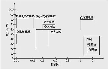 還需指出,HID引起熄滅的電壓暫降量值隨其使用時(shí)間會(huì)逐漸減小,例如鈉燈在壽命的最后階段,2%暫降就會(huì)熄滅;而在全新階段,45%暫降才能熄滅。圖8為一般用電設(shè)備對(duì)電壓暫降的敏感程度概要,各種用電設(shè)備對(duì)電壓暫降幅度有不同的耐受度,例如交流接觸器在50%以?xún)?nèi)的電壓暫降仍可運(yùn)轉(zhuǎn),但可變速馬達(dá)和高壓放電燈只容忍15%以?xún)?nèi)的電壓暫降。此外電壓暫降持續(xù)間的長(zhǎng)短,對(duì)用電設(shè)備也會(huì)產(chǎn)生不同影響。如交流接觸器在遭遇持續(xù)0.01s以上的電壓暫降即會(huì)誤動(dòng),而低壓繼電器當(dāng)電壓暫降持續(xù)1s以上才會(huì)受到影響。
