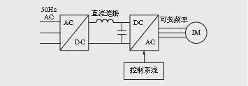 多數(shù)交流驅(qū)動(dòng)的結(jié)構(gòu)見(jiàn)圖4。三相交流電壓經(jīng)三相二極管整流器整流后由直流側(cè)電容器濾波,一些驅(qū)動(dòng)的直流側(cè)可能還會(huì)串入一個(gè)電感。整流得到的直流電壓經(jīng)電壓源型逆變器(VSC)逆變成頻率和幅值都可變的交流電壓供給電動(dòng)機(jī)。